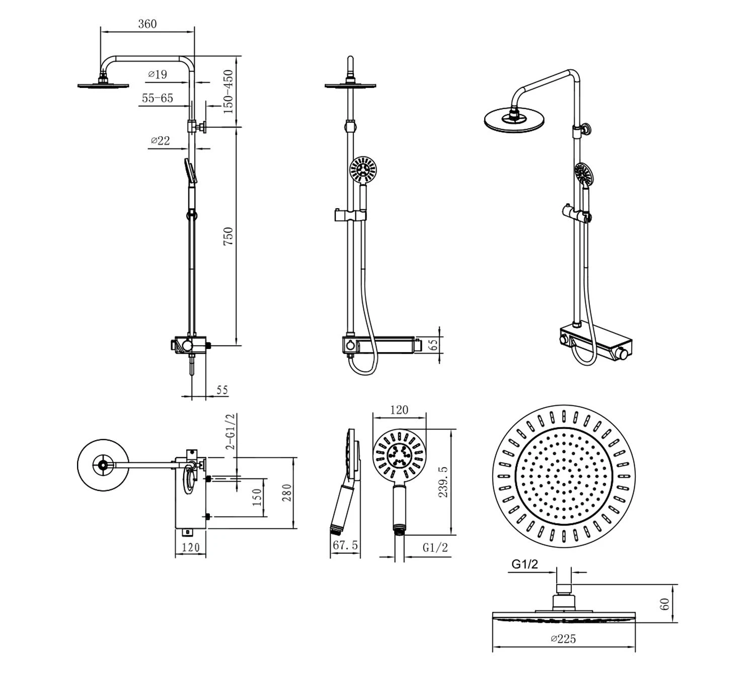 - hoofddouche: Ø 225 mm, scharnierverbinding, rubberen sproeigaatjes voor eenvoudige reiniging